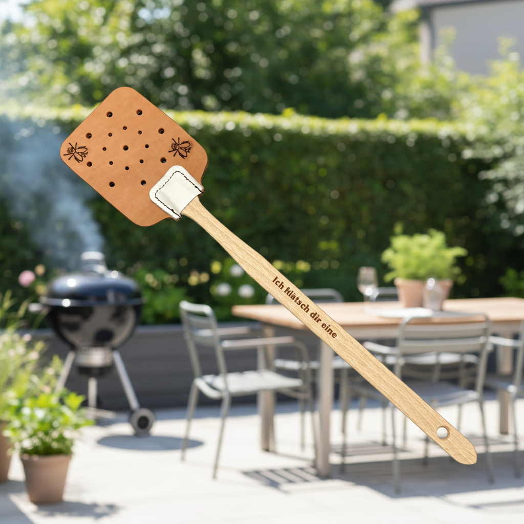 Handgemachte Rindsleder-Fliegenklatsche mit dem geniallen Spruch "Ich klatsch dir eine".